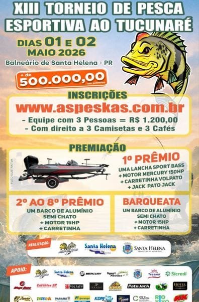 Está chegando a hora do XIII Torneio de Pesca Esportiva ao Tucunaré, organizado pela Aspeskas. Será nos dias 01 e 02 de maio 2026, em Santa Helena, PR! É o maior evento de pesca da região, que já está com as inscrições abertas!